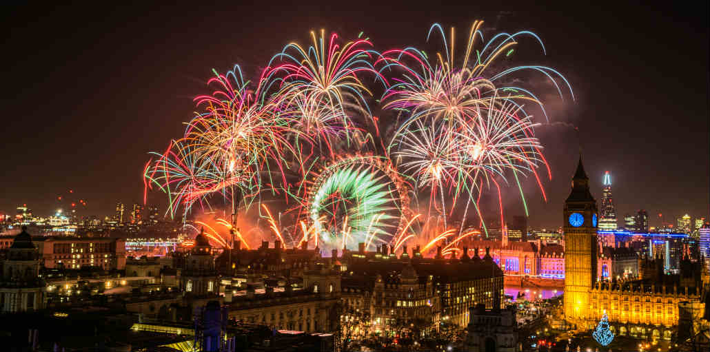 伦敦每年的12月31日除夕夜会在在市中心点燃绚丽夺目的烟花表演秀,每年的烟花表演都吸引了大量的游客及当地居民前来参观,烟花秀需提前订票,也可以选在在电视上收看实况转播。观看烟花表演分为六个不同区域,到现场观看的游客可以在威斯敏斯特大教堂、伦敦眼与大本钟附近观看璀粲夺目的烟花表演。